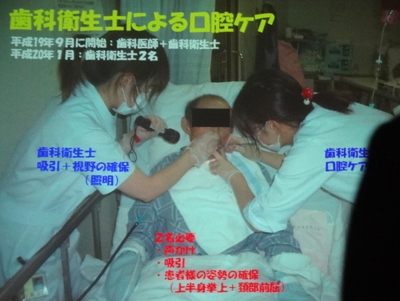 松阪市 済生会松阪総合病院 歯科口腔外科部長 佐藤耕一 先生による講演 演題:「口腔外科症例、口腔ケアの取り組み、海外での医療活動の経験」 口腔外科的症例の供覧から誤飲に対する処置まで、幅広い内容でした。 また佐藤先生は、衛生士による入院患者への口腔ケアを積極的に行われ、大変好成績を残してみえます。これからは高齢社会で在宅での口腔ケアが大切になってきますので、大変参考になりました。