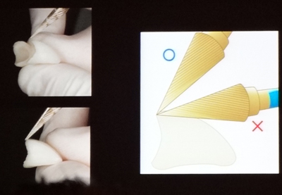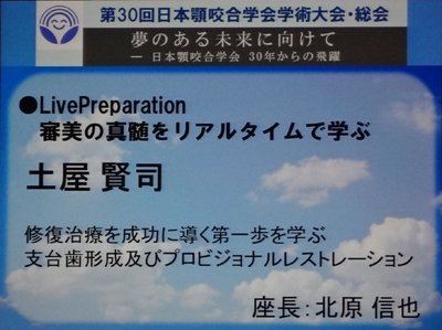 歯冠形成(冠を被せるために歯を削ること)、プロビジョナルレストレーション(精密な仮歯)、リマージング(仮歯の辺縁を歯にフィットさせる手技)について、学会会場と診療室のライブ中継が行われました。