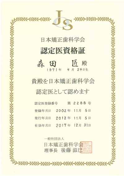 当院矯正医 森田 匠先生が日本矯正歯科学会認定医の更新を行いました。 更新には、5年間で定められた数の学会出席や学会発表などの必要が有り、資格は一度取ったら一生続くというものではありません。 こうして認定医資格を更新していくことが正しい勉強の証と言えるでしょう。