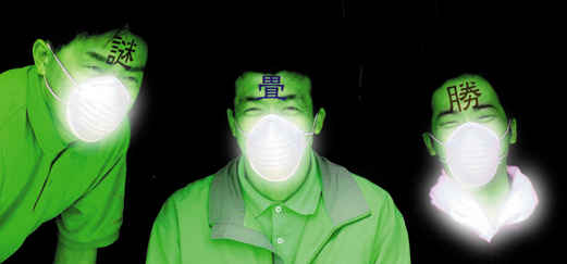 ●修行中の仲間紹介● ※写真は最近の布教活動でのスナップ 額に現れた呪文は、その人の「徳」をあらわします。 法螺のパワーに満たされたときに現れる、ありがたい超力です。